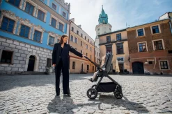 Door de schokdemping op de rubberen voor- én achterwielen rijdt de wagen erg comfortabel op elk terrein. De voorwielen zijn 360° draaibaar, maar ook vast te zetten wat bijvoorbeeld handig is tijdens een boswandeling of ander ruw terrein. De duwstang heeft een lederen bekleding en is verstelbaar in hoogte, wel zo fijn.Â