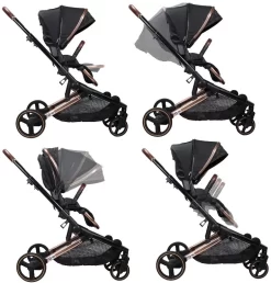 Deze wagen is vanaf de geboorte te gebruiken, doordat de zitjes in volledige ligpositie geplaatst kunnen worden. Ook kan je op het frame één of zelfs twee reiswiegen (niet meegeleverd, apart verkrijgbaar) plaatsen. De wagen bestaat dan dus uit een wandelwageninzet met reiswieg óf twee reiswiegen. De reiswieg kan je zowel boven als onder op het frame plaatsen en kan ook in twee richtingen op het frame geplaatst worden. Om de reiswieg op het frame te plaatsen heb je geen aparte adapters nodig.Â