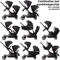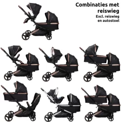 - Eén reiswieg naar binnen en één wandelwagenzitje naar binnen of buiten gericht (reiswieg niet meegeleverd, apart verkrijgbaar)