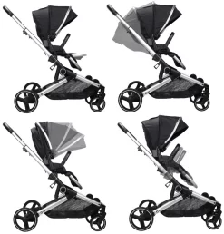 Twee reiswiegen, twee wandelwageninzetten, twee groep 0 autostoelen, verstelbare XL zonnekap, beenkap en ruime boodschappenmand - Maximaal gewicht: