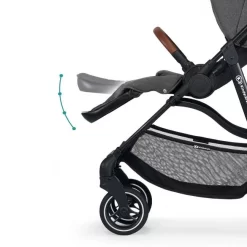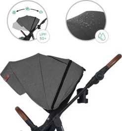 De schokabsorberende vering op alle wielen zorgt ervoor dat je kleintje altijd comfortabel zit, ook al is de weg hobbelig. De rugleuning is tot volledige ligpositie te verstellen en de voetsteun is ook in meerder standen te verstellen. Je kindje zit veilig vast in de 5-punts veiligheidsgordel met gordelkussentjes. De wagen heeft verder een verwijderbare valbeugel en een ruime zonnekap, met kijkvenster en ventilatiegaas, om je kleine te beschermen tegen de zon.Â