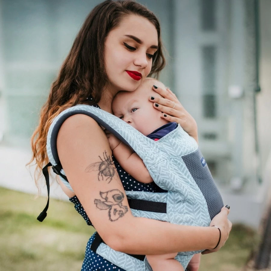 De draagzak is ergonomisch en zorgt daarom voor een goede ontwikkeling en houding van je kindje. Je kindje zit in de draagzak naar je toe gericht in een kikkerhouding, die de ruggengraat perfect ondersteunt. De draagzak is zowel voor je te dragen (op de borst) of achter je (op de rug). Daarnaast zijn de schouderbanden recht of kruislings te dragen.Â